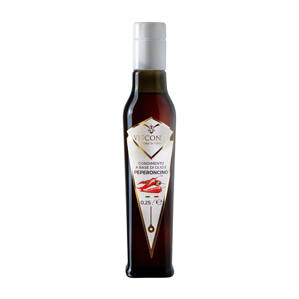 The hot peppers are left in infusion in freshly pressed extra virgin olive oil, to better preserve the flavors. The procedure is carried out with precise timing and with right quantities, carefully measured. It gives vitality to foods and makes them more palatable and it is a condiment for strong palates, who love strong tastes. The recipe is jealously guarded by the Visconti family.