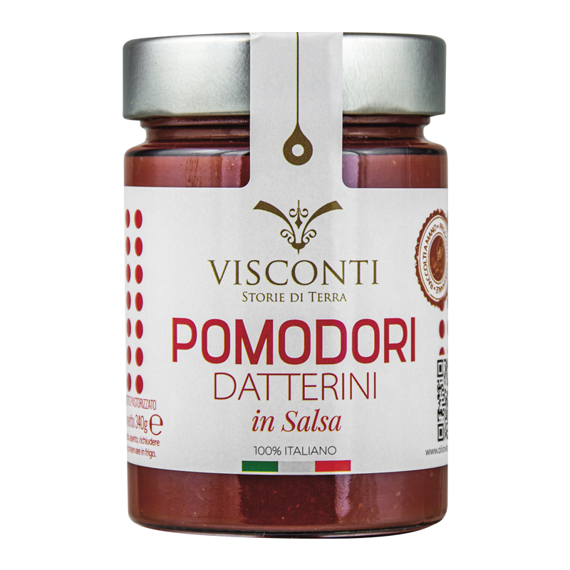 The red datterino tomato is distinguished by its elongated date shape. Our datterino, with its unmistakable sweetness, is preserved whole in tomato sauce, preserving its delicacy over time. With an intense flavor and an extremely thin bright red skin. Without any addition of dyes or preservatives.